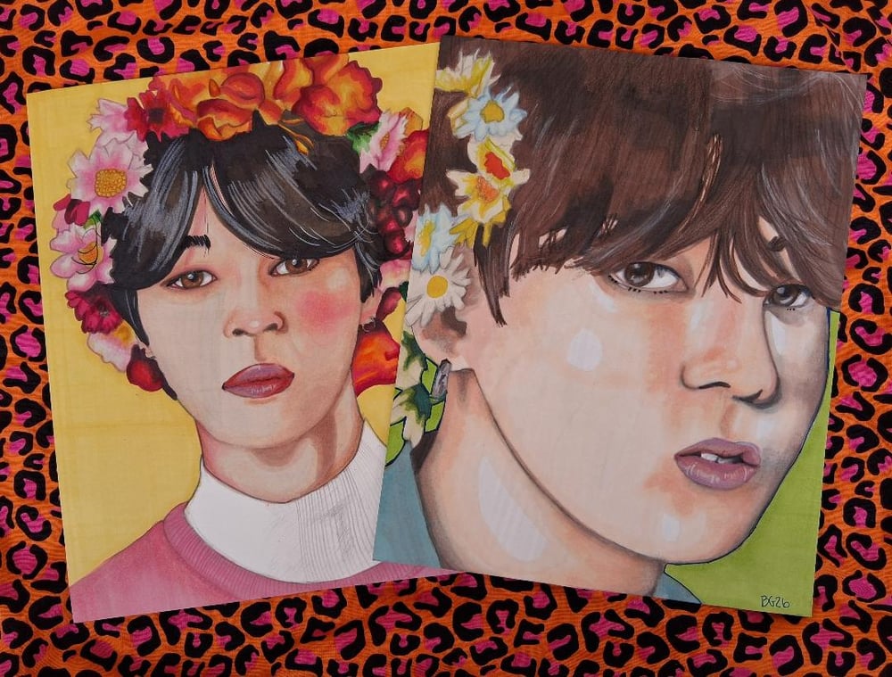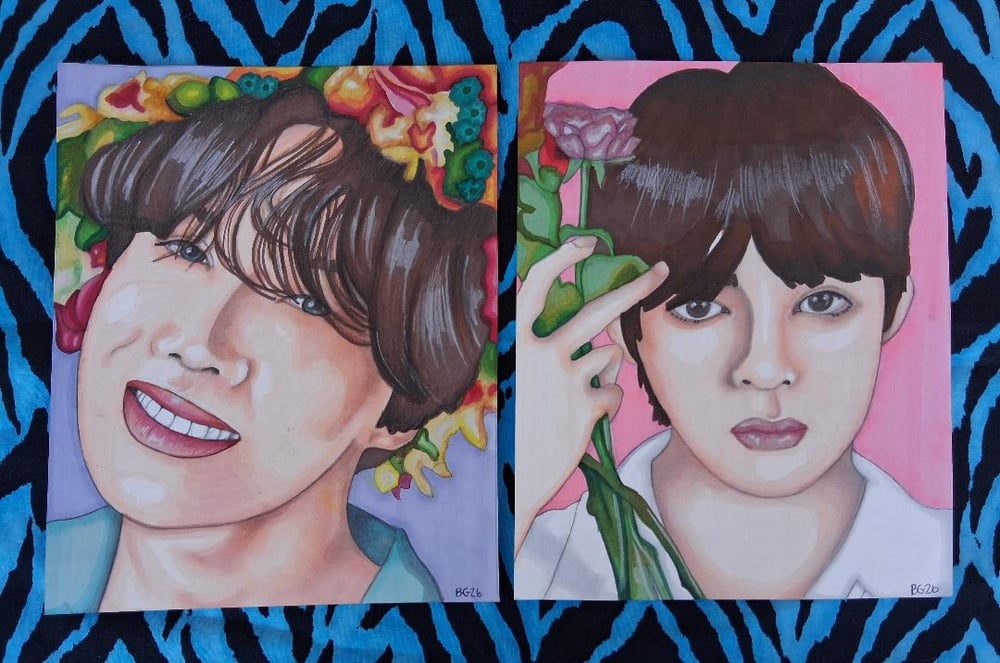 Marker drawings of Kpop idols, signed and varnished to protect against UV exposure. Suga and Jin are 6"x8" and the remaining drawings are 8"x10".
