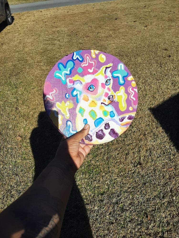 Colorful 90s inspired puppy painting on wood cut out. Varnished, stamped, and ready to hang.