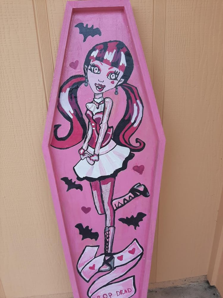 46" hand painted coffin. Varnished, stamped, and ready to hang.