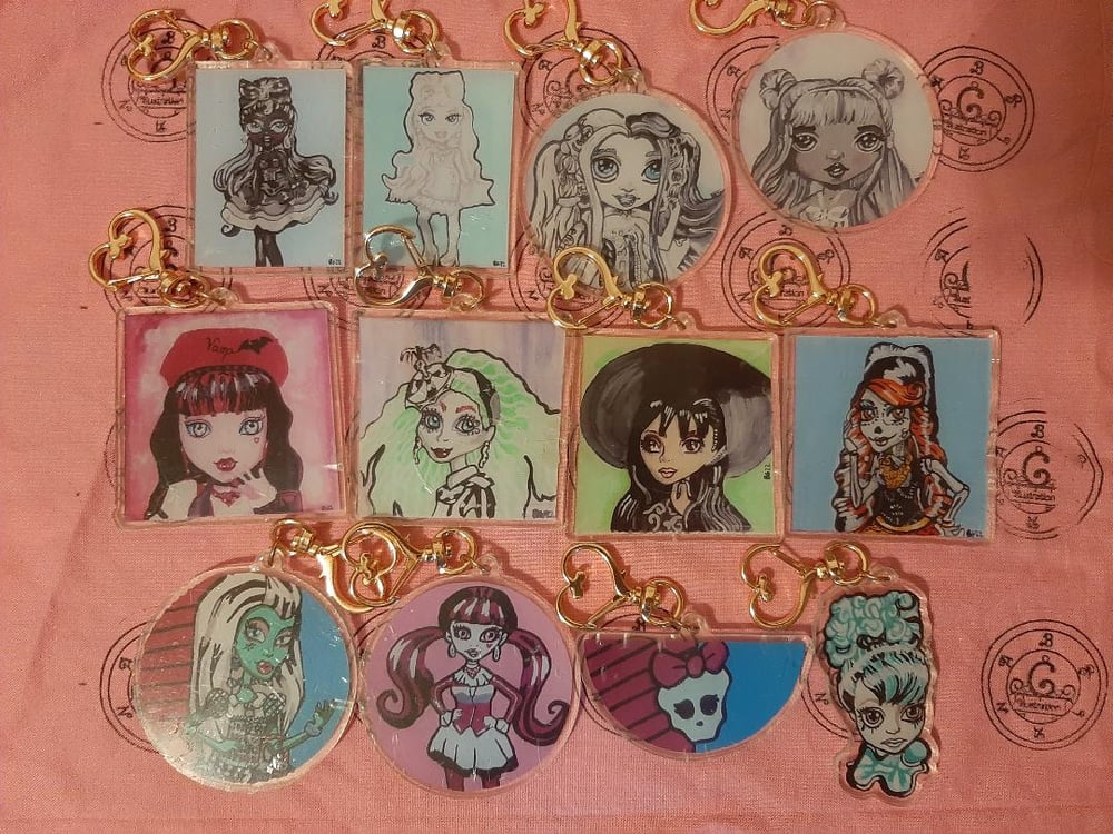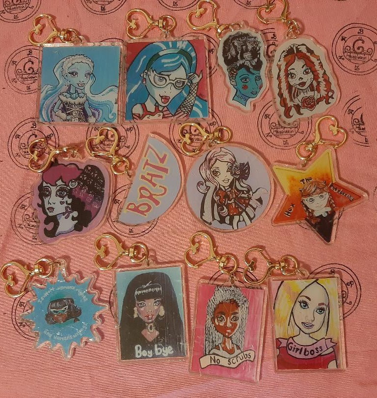 Each bag has 12 possible designs, there are 6 randomized keychains inside. Option 1: Monster High, Shadow High, Bratz, etc Option 2: Monster High, Shadow High