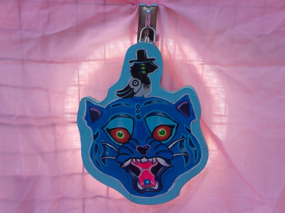 Woodcut out painting of Derpy and the magpie. Eyes of both characters and mouth of tiger are uv reactive. Varnished, stamped, and ready to hang.
