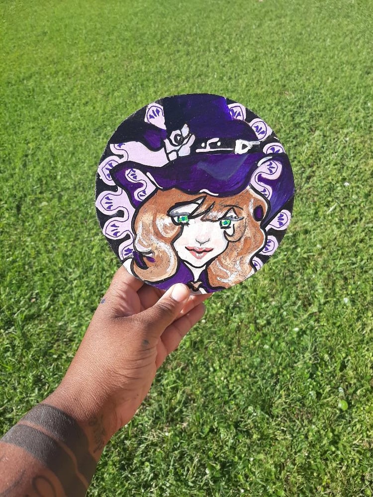 6" wood cut out paintings of girls from a very popular modern RPG game. Each painting glitters, is UV reactive, has a stamp on the back, and is ready to hang.
