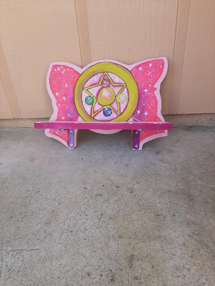 Magical girl inspired shelf for figurines and plushies. Approximately 15.5 in wide. Ready to hang.