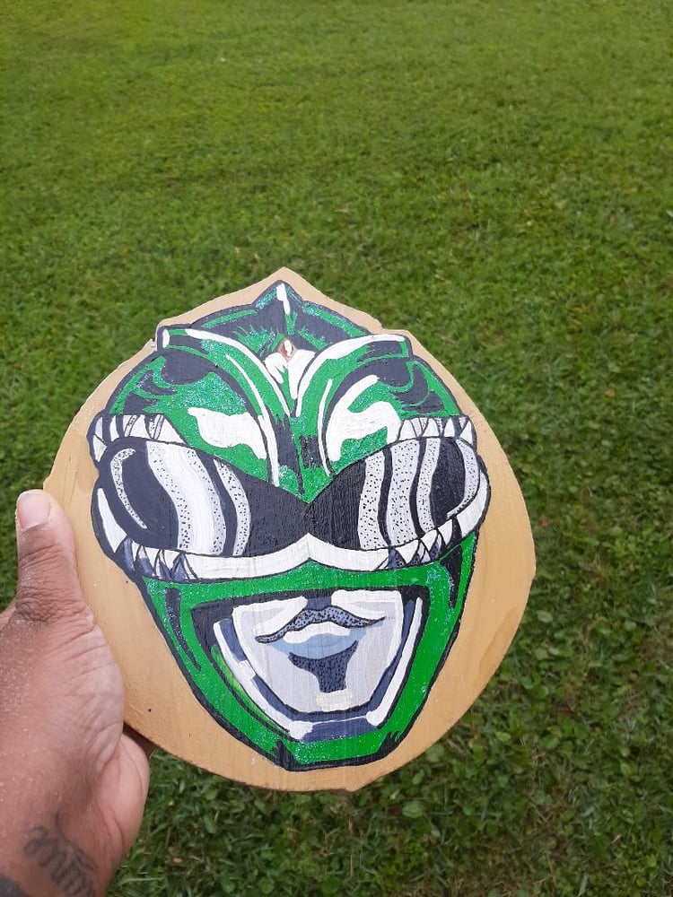 Iconic green MMPR helmet. Acrylic on wood cut out. Varnished, stamped, and ready to hang!