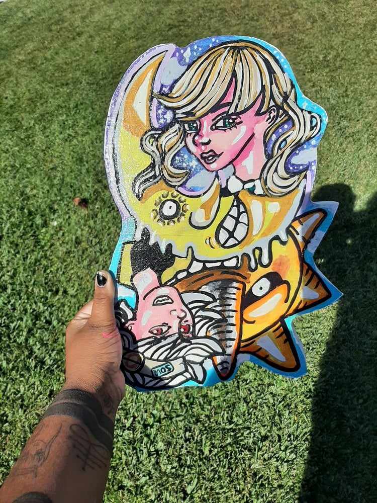 Anime inspired wood cut out painting. Stamped, varnished, and ready to hang.